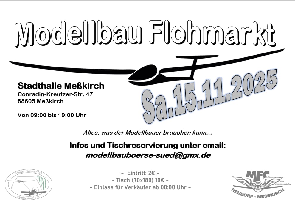 - Modellbauflohmarkt in MeßkirchAm Samstag, 15. November veranstalten wir zusammen mit dem MFC Pfullendorf e.V. einen Modellbauflohmarkt in der Stadthalle in Meßkirch. Wir freuen uns auf euch als Besucher oder Verkäufer. Interessierte Verkäufer können noch Tische buchen unter modellbauboerse-sued@gmx.de