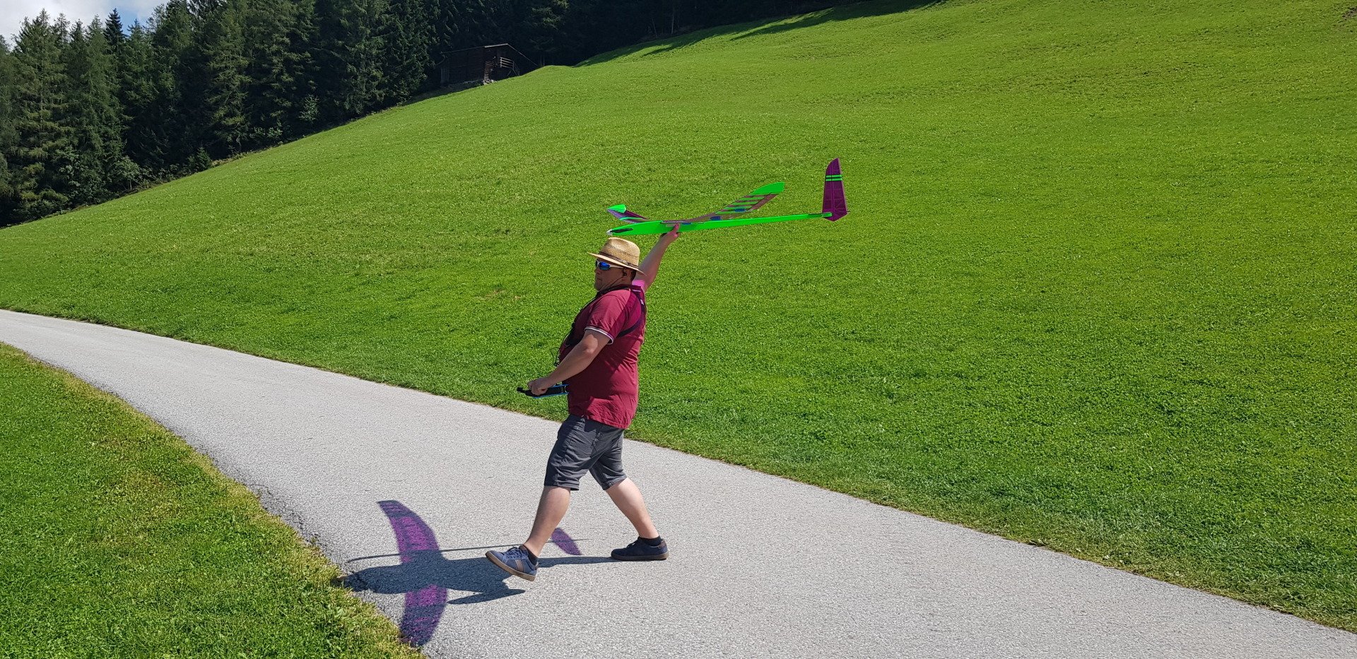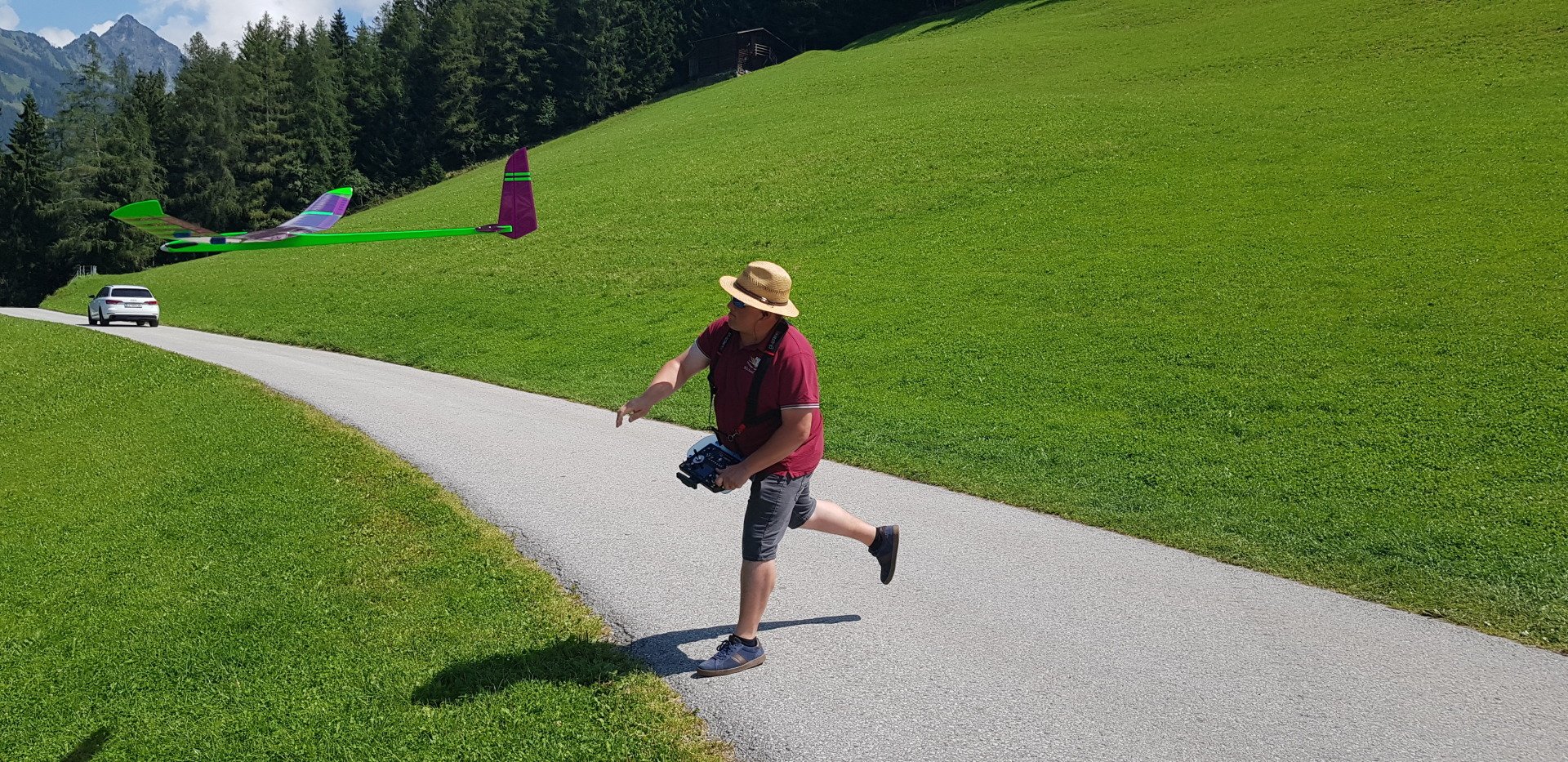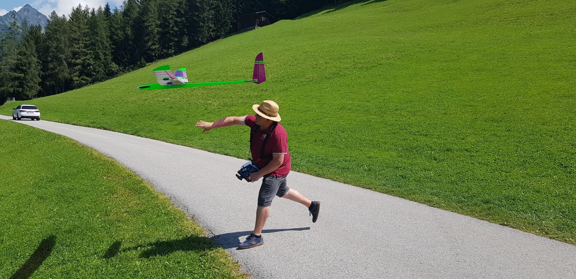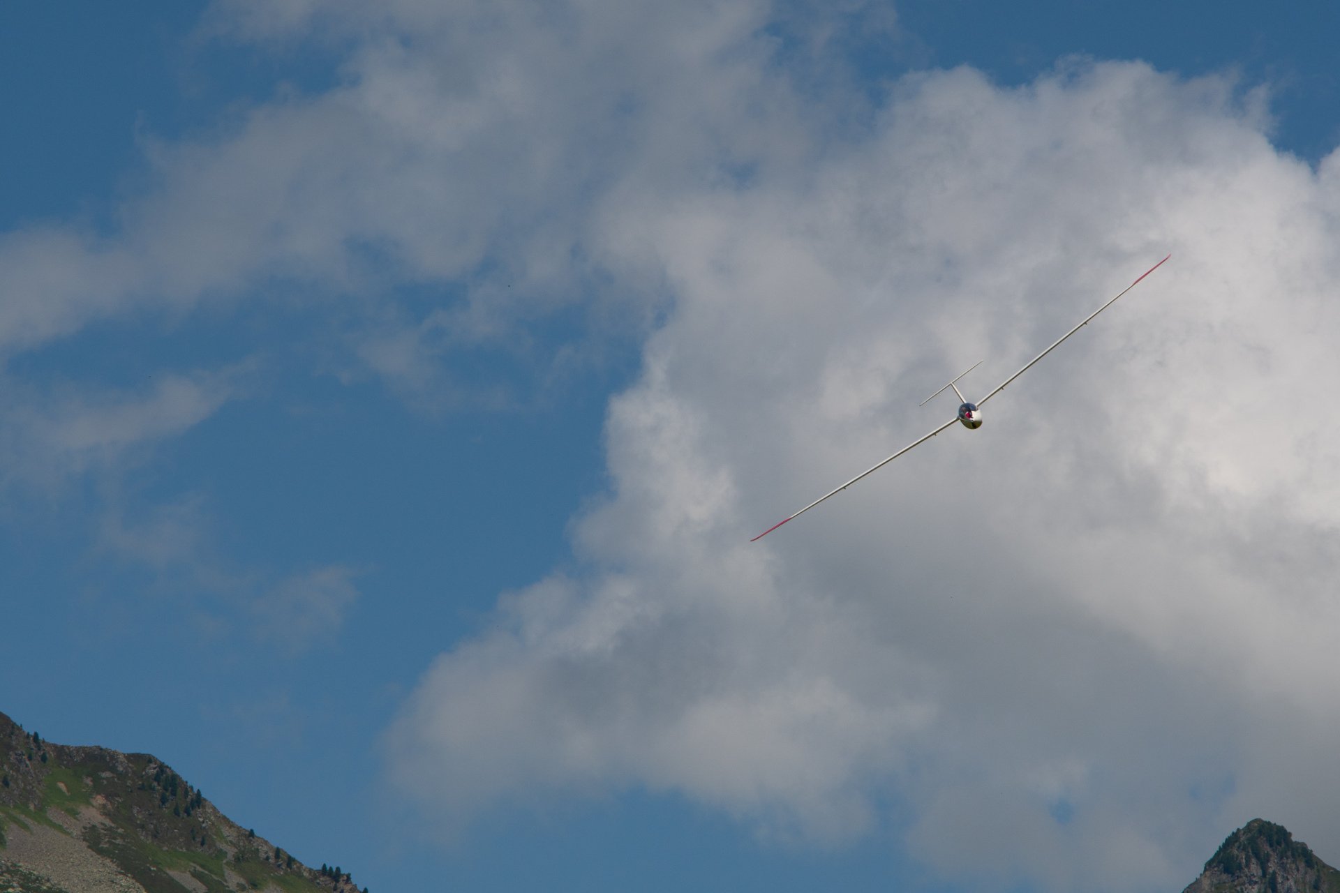 Zuerst im Aufwind hochkurbeln. Dann „tief von oben“ (mindestens 400 m) und anschließend Speed- und Kunstflug!