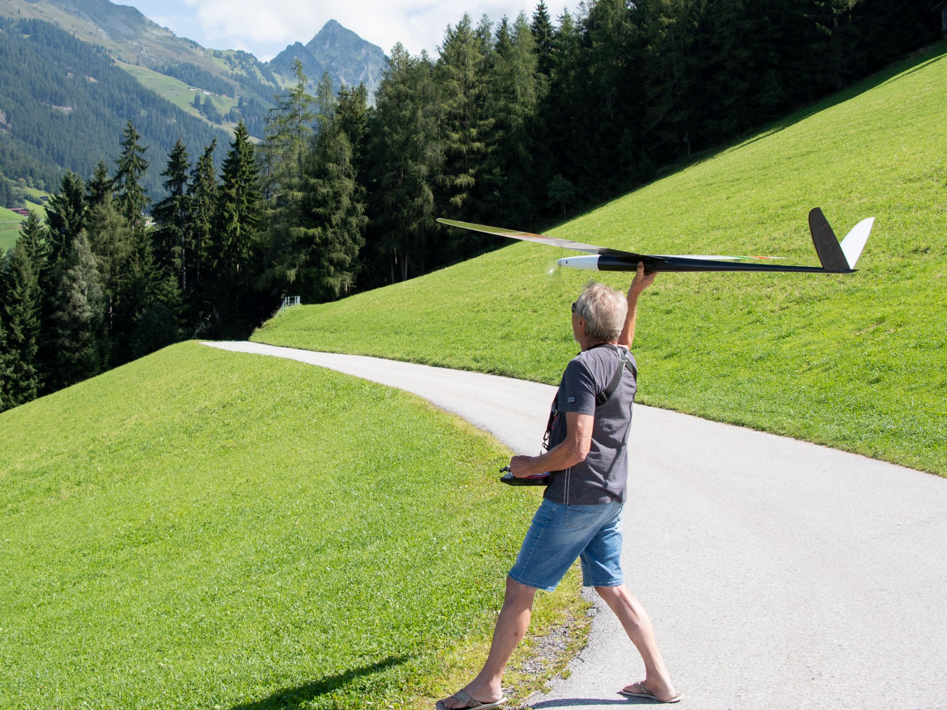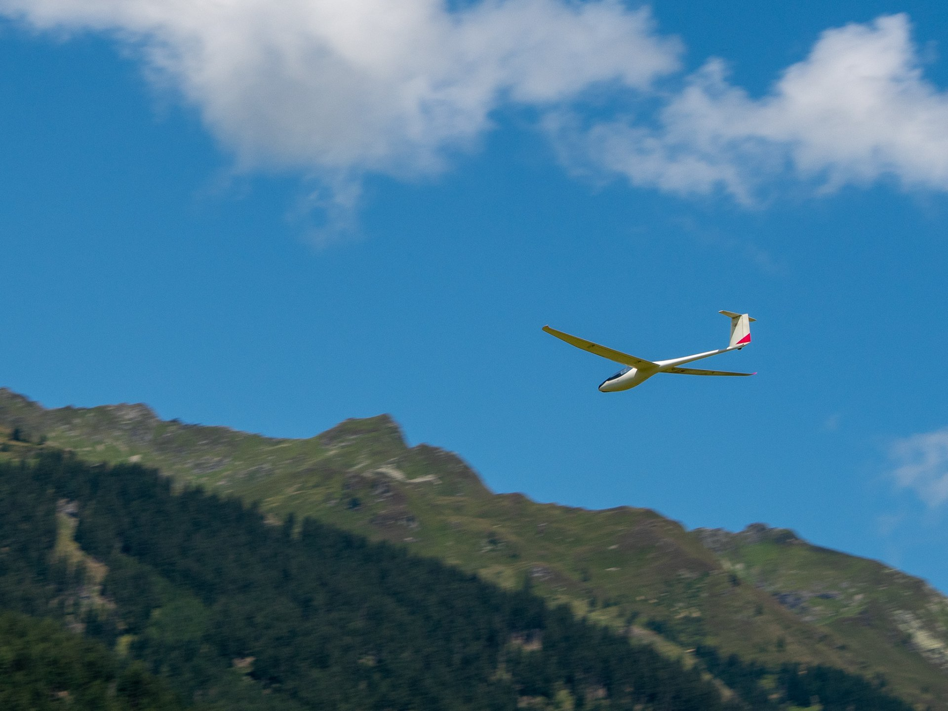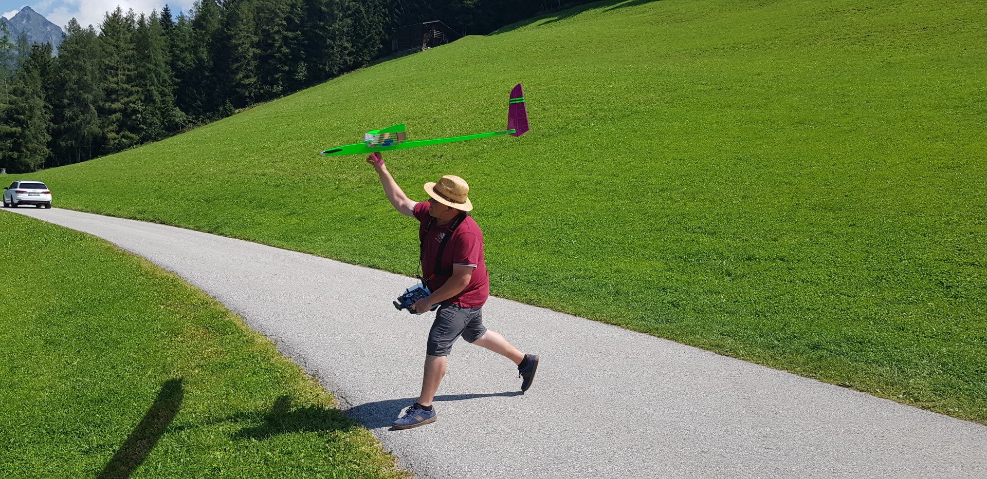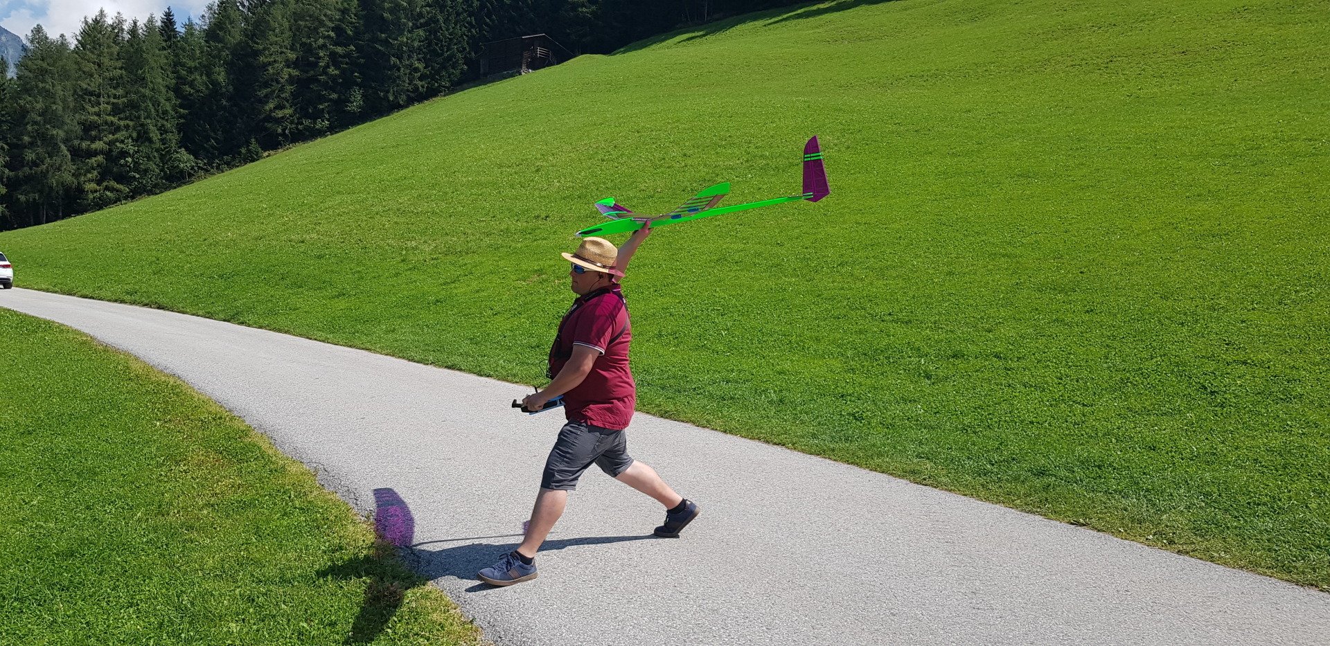 Zuerst im Aufwind hochkurbeln. Dann „tief von oben“ (mindestens 400 m) und anschließend Speed- und Kunstflug!